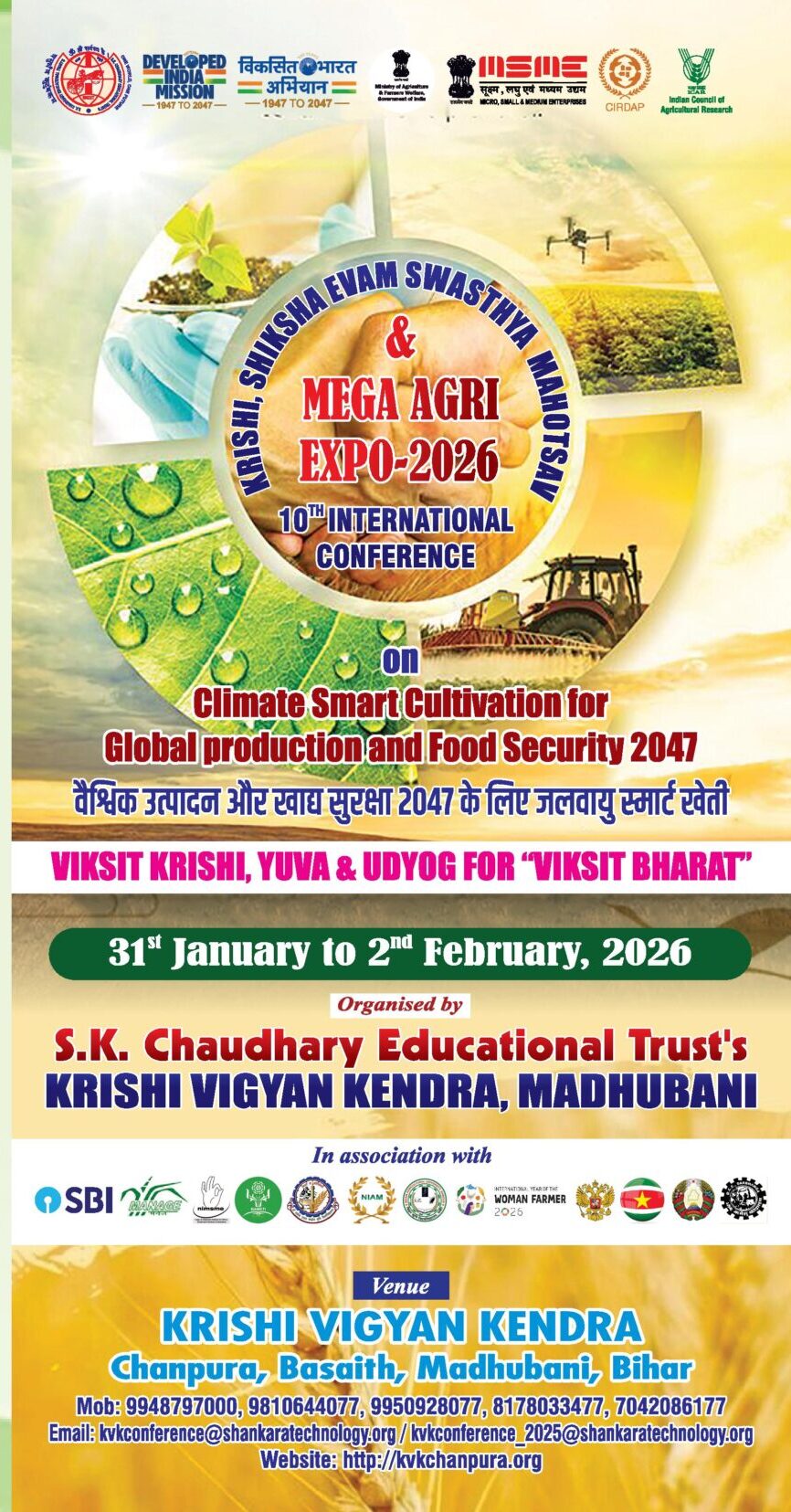 Krishi Vikas Sammelan and Mega Agri Expo 2026 is an International Conference on Vision for Agricultural Development and Emerging Challenges – 2026 to be held on January 31, February 01,02 2026 at KRISHI VIGYAN KENDRA, Chanpura, Madhubani, Bihar, aims to provide an international forum for researchers, developers and solutions to exchange their valuable ideas and showcase the ongoing works which may lead to path of Entrepreneurship Development in India through Agriculture.